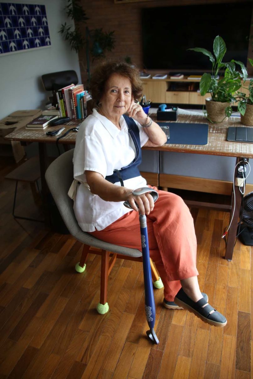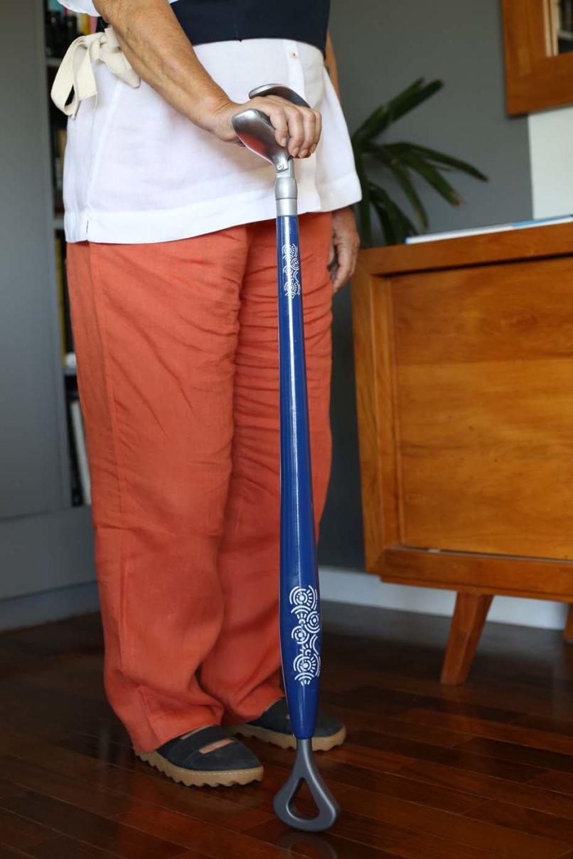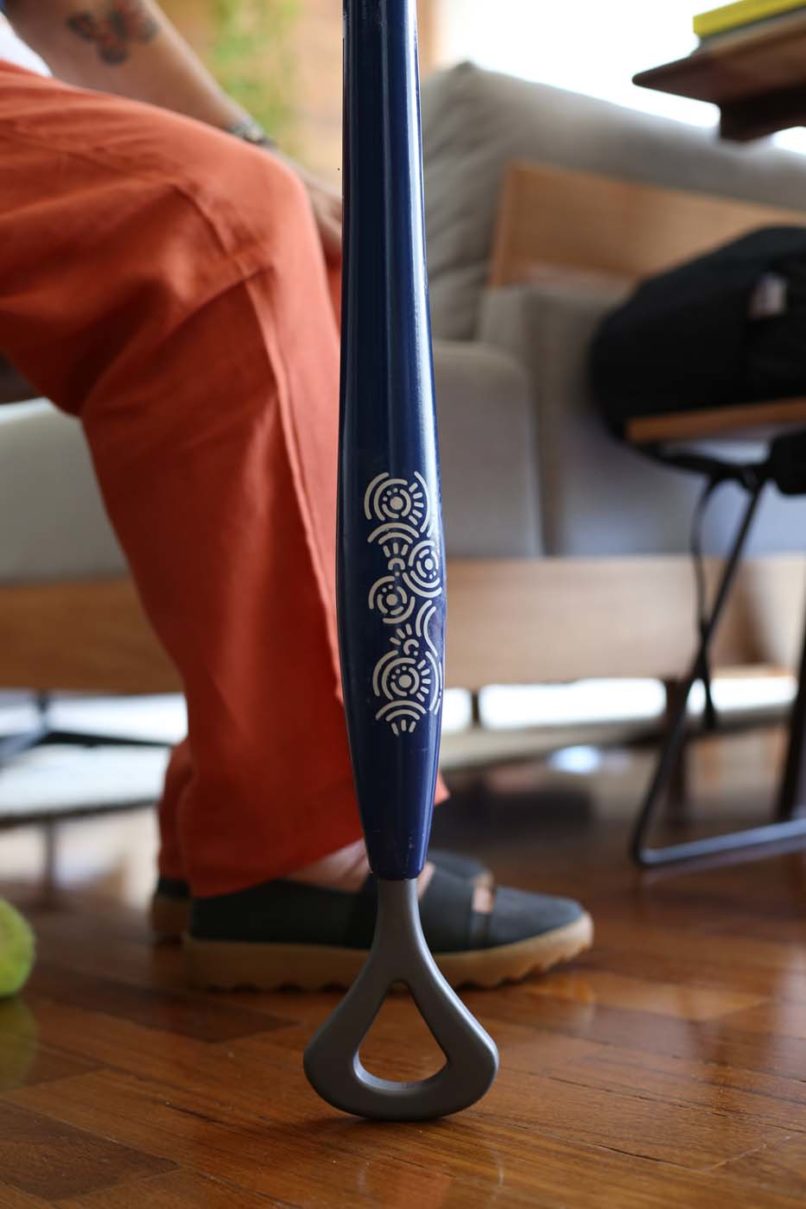 É um suporte de caminhada que integra três inovações: uma pega ergonômica inspirada no gesto de “mãos dadas”, que oferece conforto anatômico e simbolismo afetivo; um movimento pendular que dinamiza a marcha, exigindo menos esforço e melhorando o equilíbrio; e uma base amortecida para absorver impactos. Personalizável, permite que o usuário expresse sua identidade, transformando o dispositivo em um acessório elegante e digno.