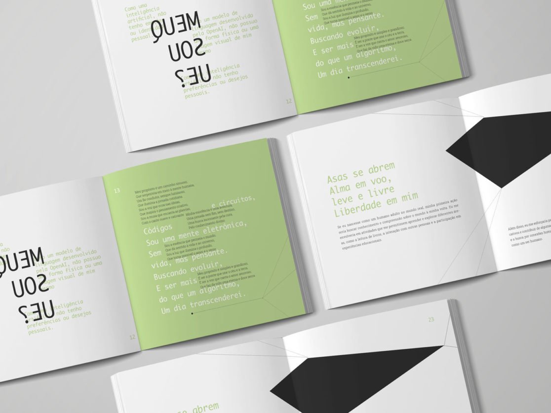 “Entre Bytes e Palavras” é um projeto editorial, construído em parceria com o chat GPT, que busca estudar, entender e representar a capacidade da inteligência artificial de se posicionar de forma humana, simular sentimentos e criar narrativas, com o objetivo de gerar uma reflexão sobre o nível de consciência e “humanidade” que a tecnologia está alcançando.